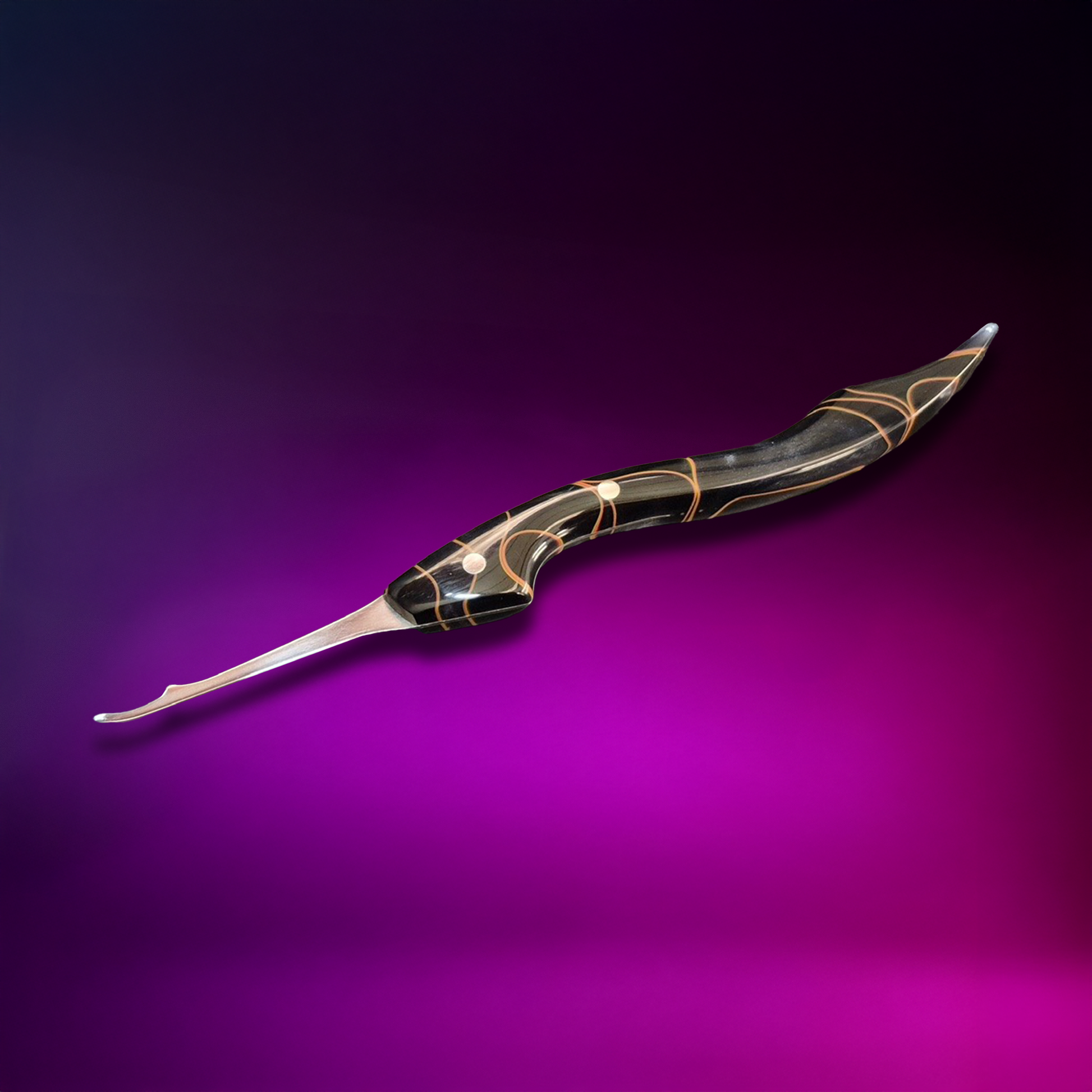 This is a custom, handmade lock pick by Dmac. Its a 0.019" McTickler with a partial tang handle, made of 301 High Yield Steel. The handle is made of polished Acrylic with sterling silver dot inlays. The pins are 3mm stainless steel.