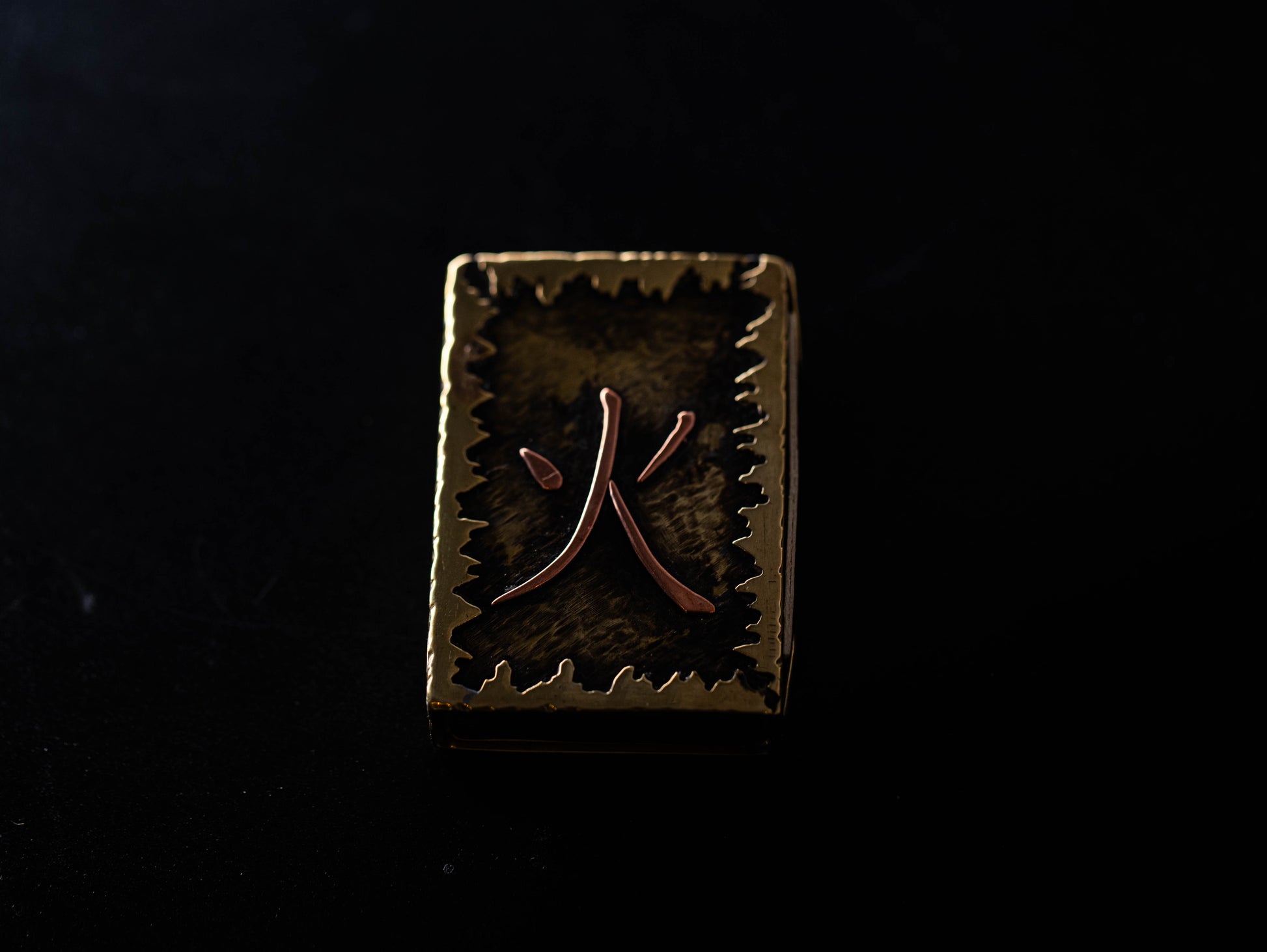This Matchbox features the Japanese kanji for “fire” and is only the fourth one Killermaru made. This version is one of the most ornate and detailed so far. The ignition strip can be replaced easily, just cut one from a standard matchbox and swap it in.