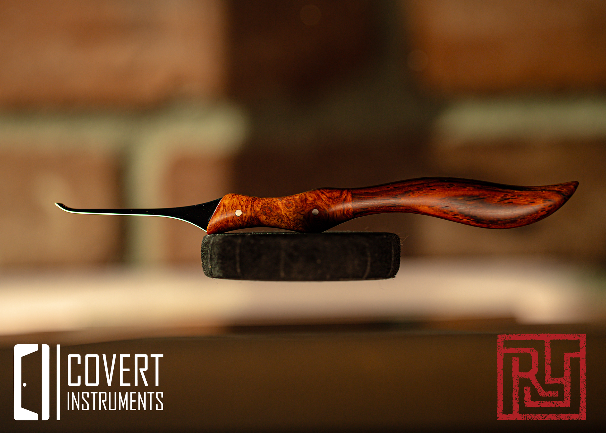 This is a custom, handmade lock pick by Ratyoke. Its a 0.023" short hook with a partial tang handle, made of 301 High Yield Steel. The handle is made of Cocobolo and Amboyna Burl. The pins are Sterling Silver.