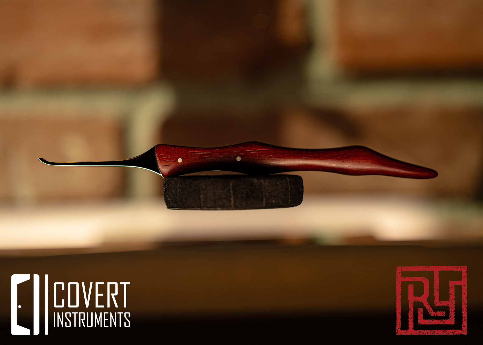 This is a custom, handmade lock pick by Ratyoke. Its a 0.023" short hook with a partial tang handle, made of 301 High Yield Steel. The handle is made of Burmese Rosewood. The pins are Sterling Silver.