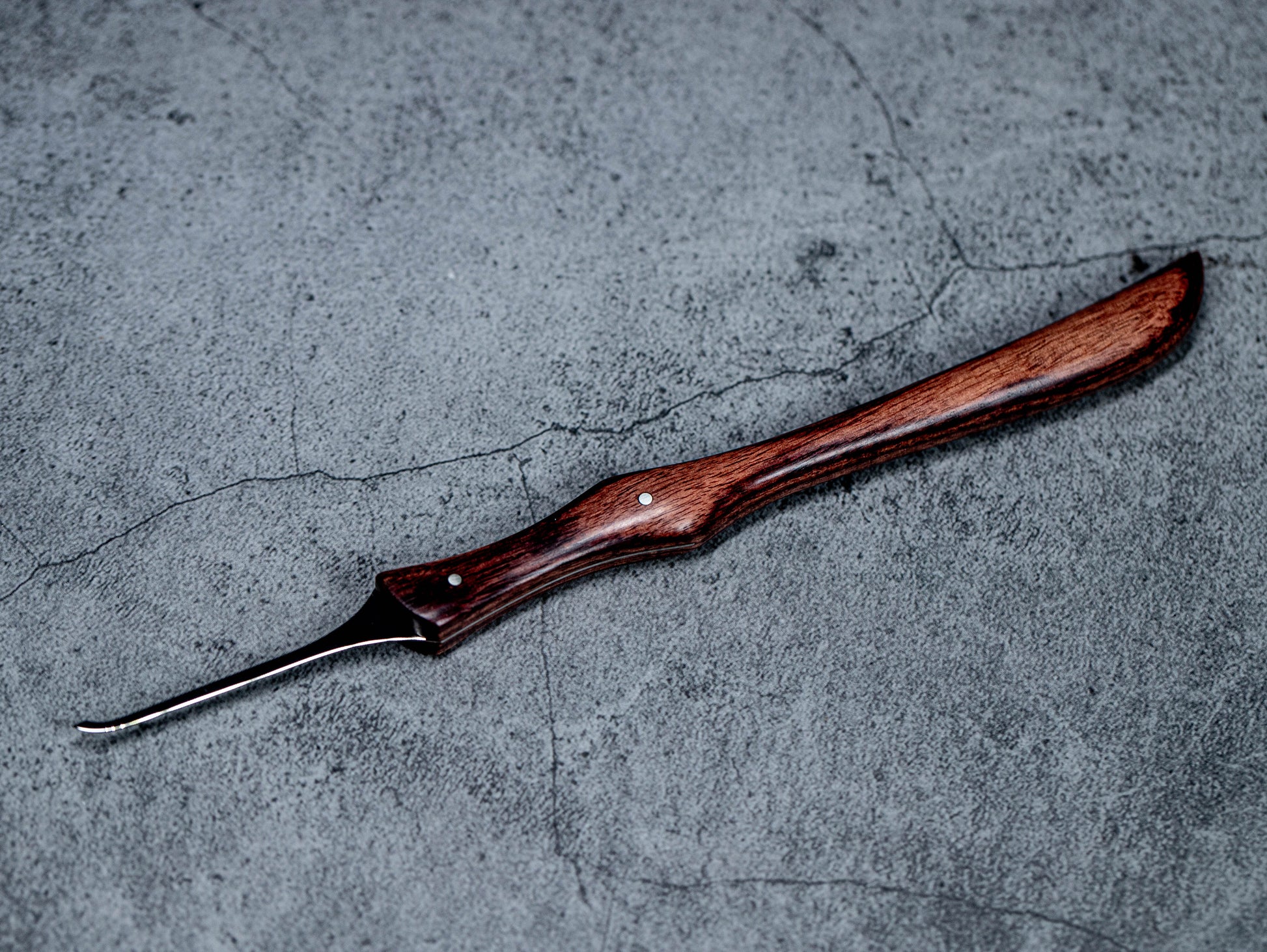 This is a custom, handmade lock pick by Ratyoke. Its a 0.019" short hook with a partial tang handle, made of 301 High Yield Stainless Steel. The handle is made of Kingwood and the pins are Sterling Silver.