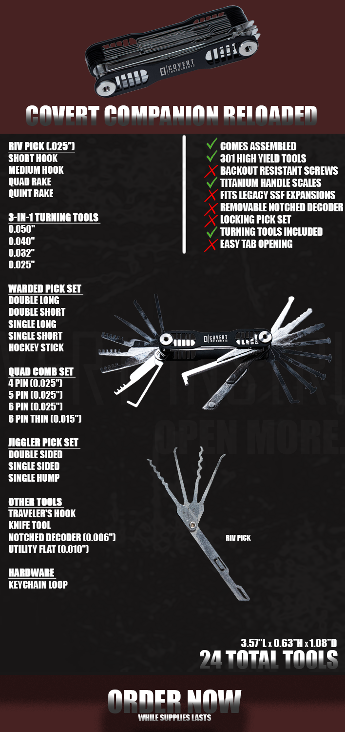 Unlike earlier versions, this redesigned Covert Companion now ships fully pre-assembled, ready to use out of the box. It also includes not only the original core tools, but also the two most popular expansions, Riv Pick and Turning Tools, making it a far more complete solution than the original release.