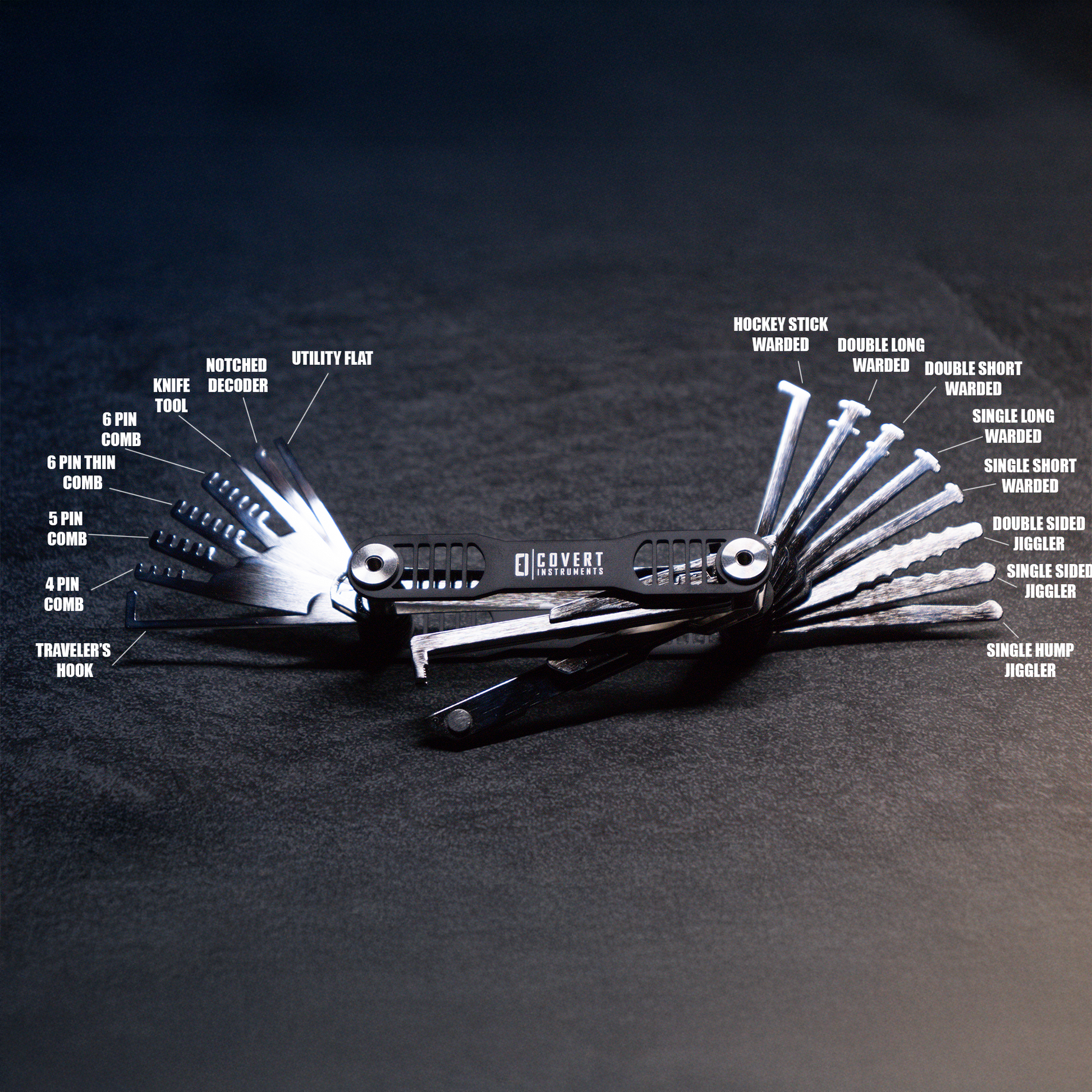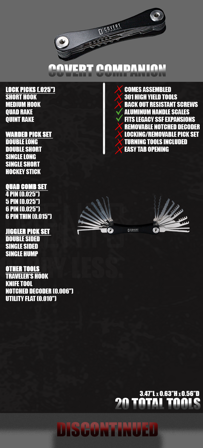 The Covert Companion is the product that started it all. As the original flagship tool from Covert Instruments, it redefined how lock bypass tools could be carried, consolidated, and deployed. It was the first tool of its kind to offer a compact, pocket-friendly system capable of holding multiple lock picking and bypass tools in a single, discreet form factor.