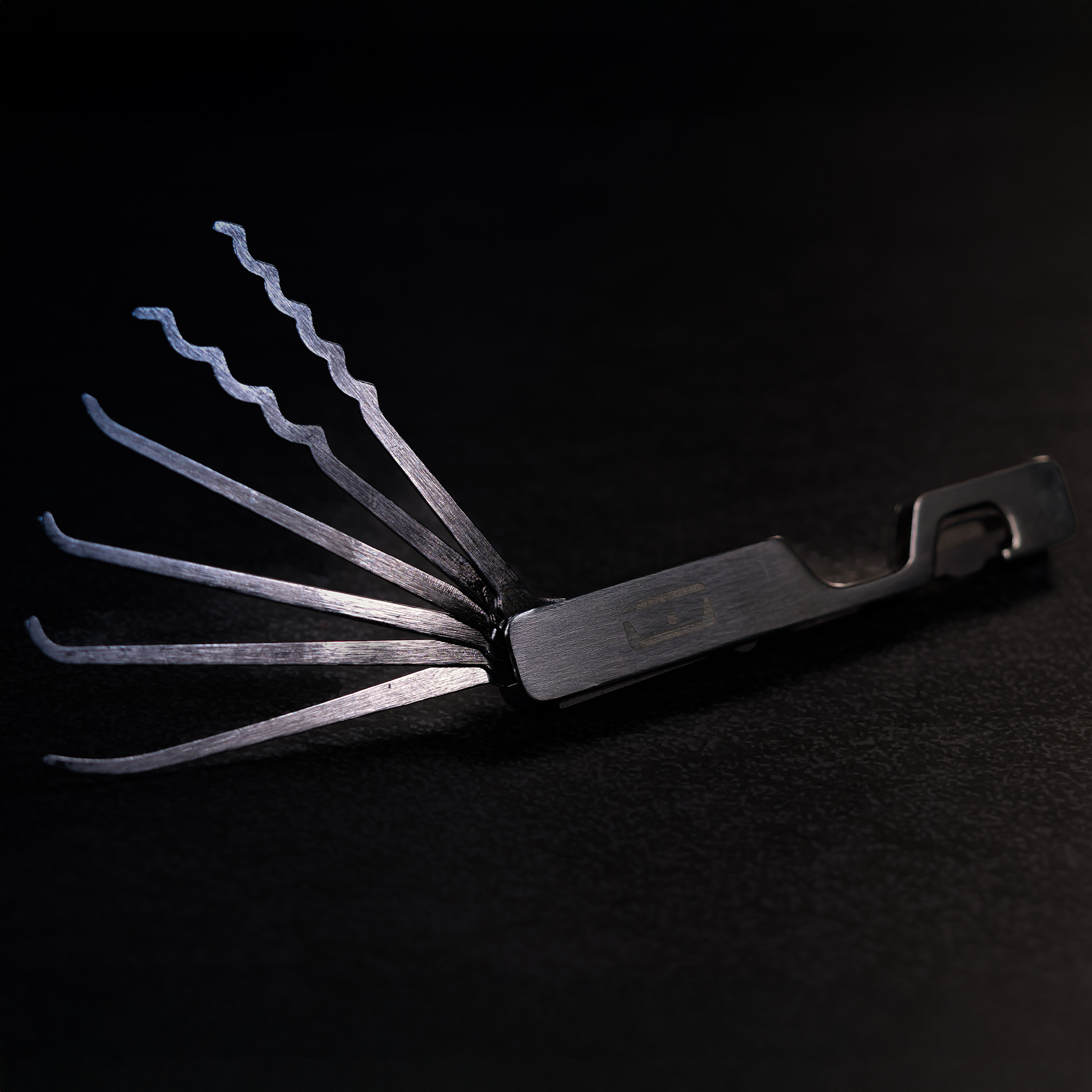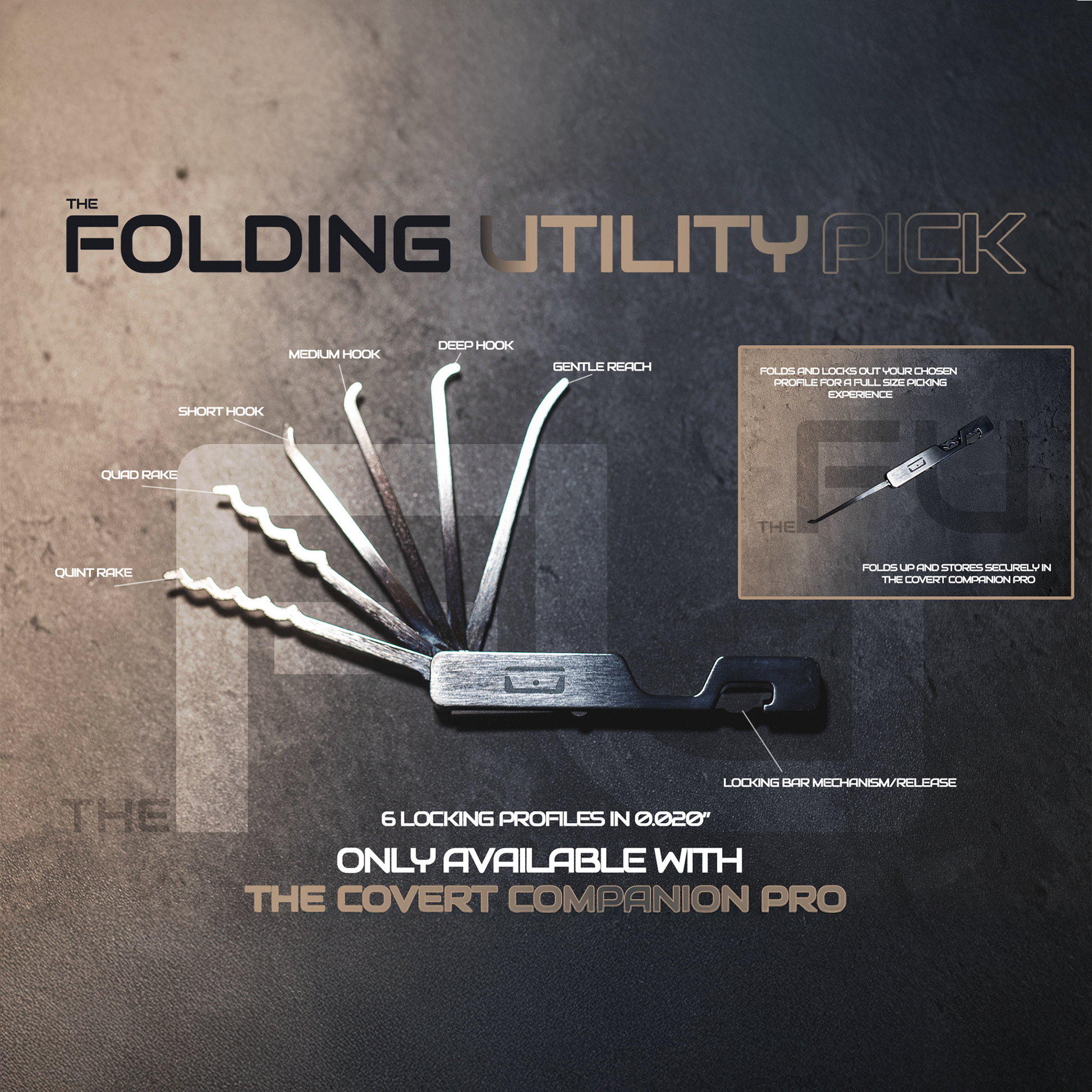 A deep-carry pocket clip ensures low-profile, secure carry. The included Folding Utility Pick (FU Pick) houses six lock picks in 0.020" thickness: short hook, medium hook, deep hook, gentle reach, quad rake, and quint rake. Each locks into place for confident use.