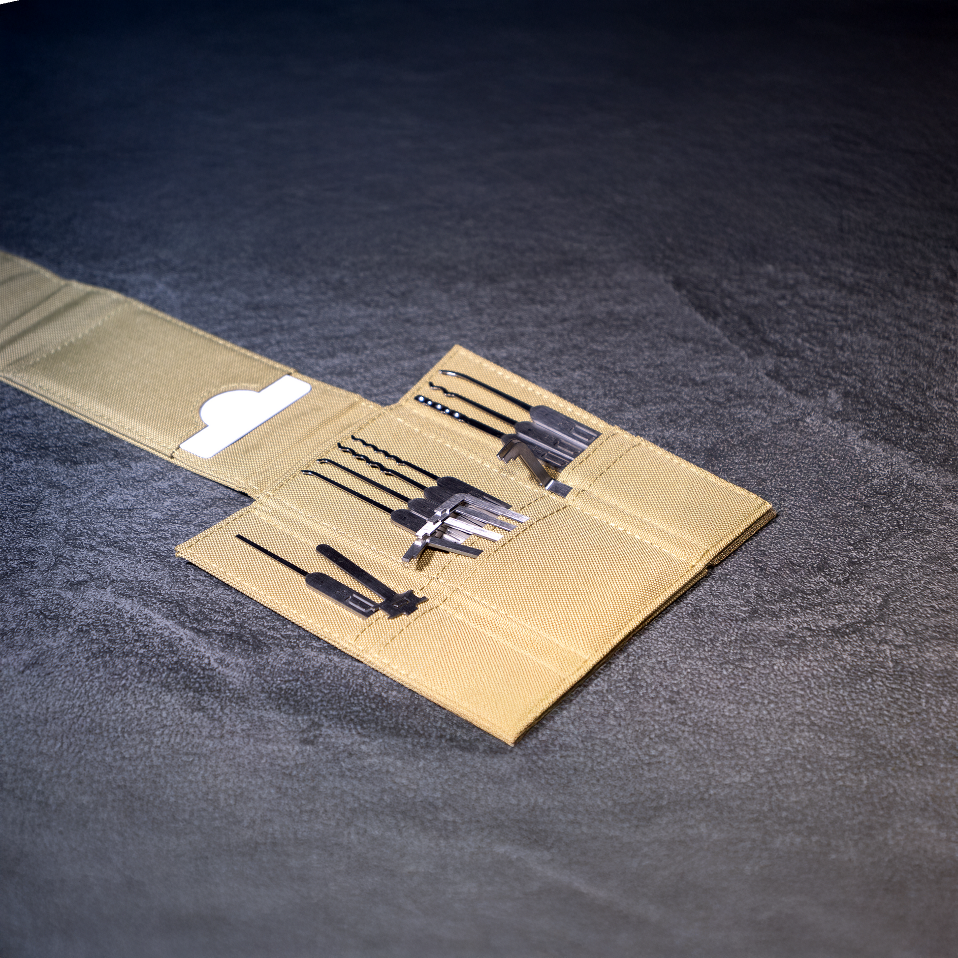 - 9 pockets of various sizes to store picks, turners, or even Lishi