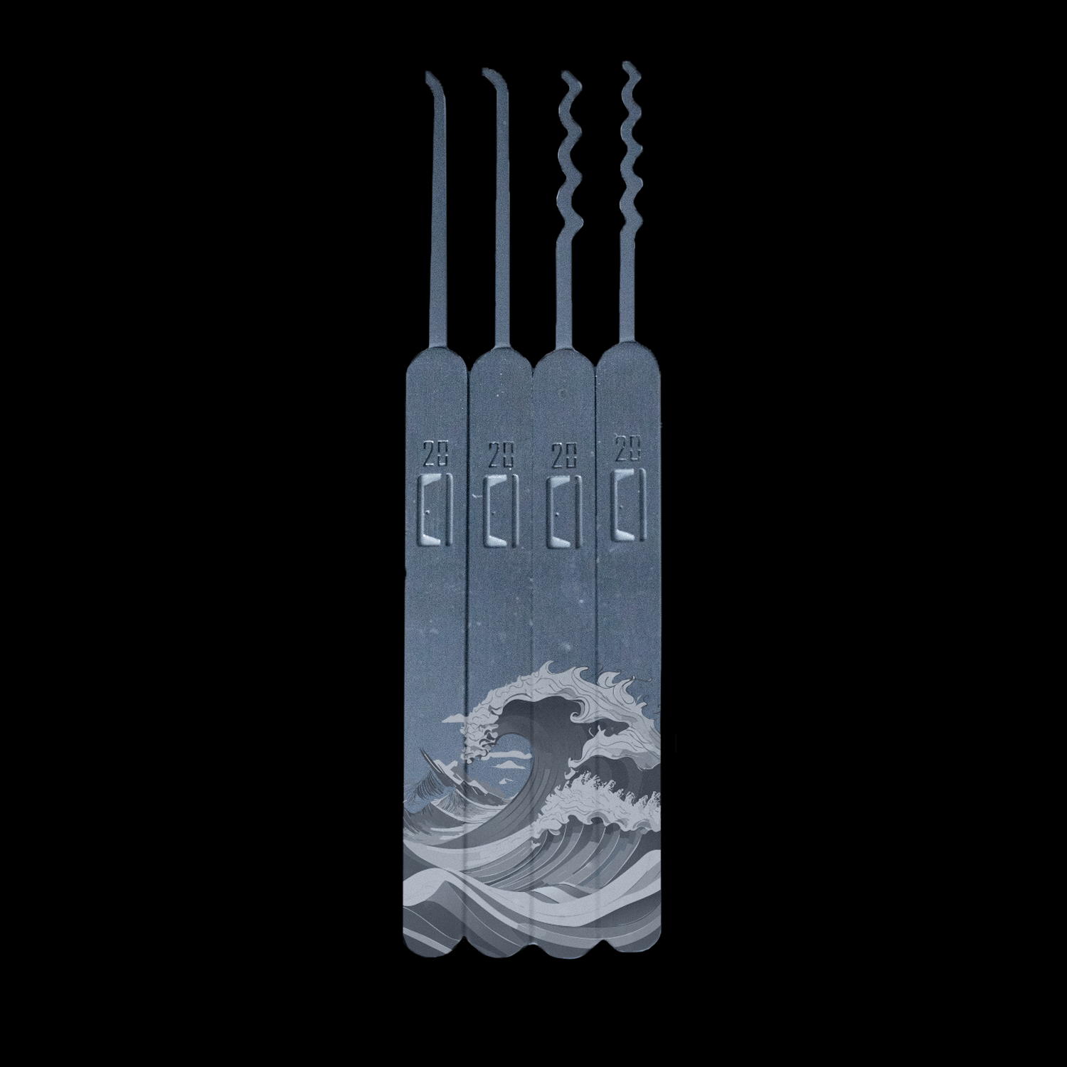 This is our Genesis Pick Set featuring our Waves design on the front of the handles. Also, for the first time, you can now purchase it in both a 0.025" and 0.020" thickness! It is hands down the best introductory pick set on the market today. We combine the four most useful pick profiles with the highest quality turning tools and package them in the most well thought out carrying case on the market. Whether at your desk or in the field, this kit will serve you well into the intermediate/advanced level.