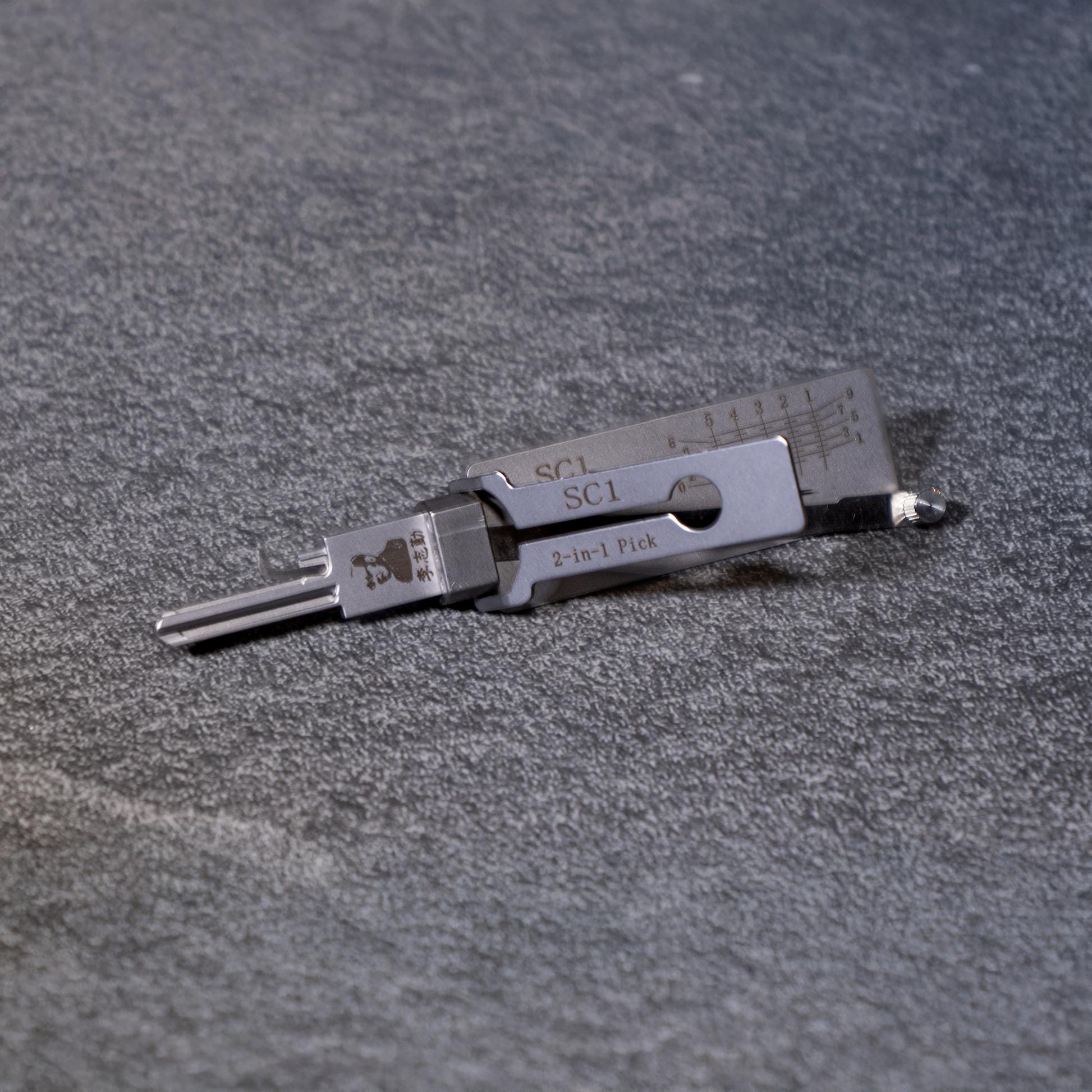 This Lishi variant fits in the SC1 (5 Pin) keyway —THE MOST COMMON RESIDENTIAL KEYWAY IN THE U.S.A. — commonly found on locks made by Schlage and several other companies.