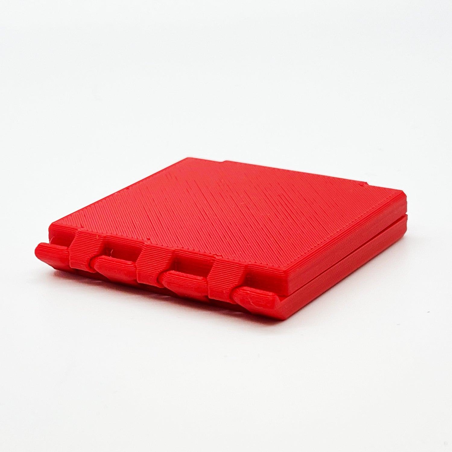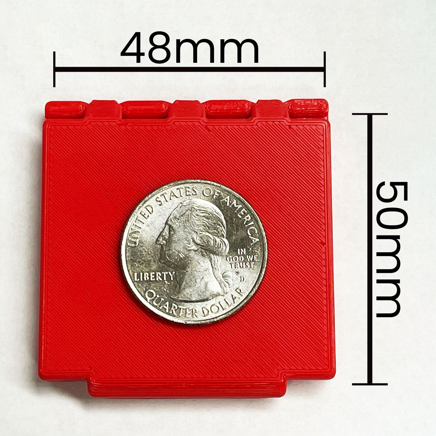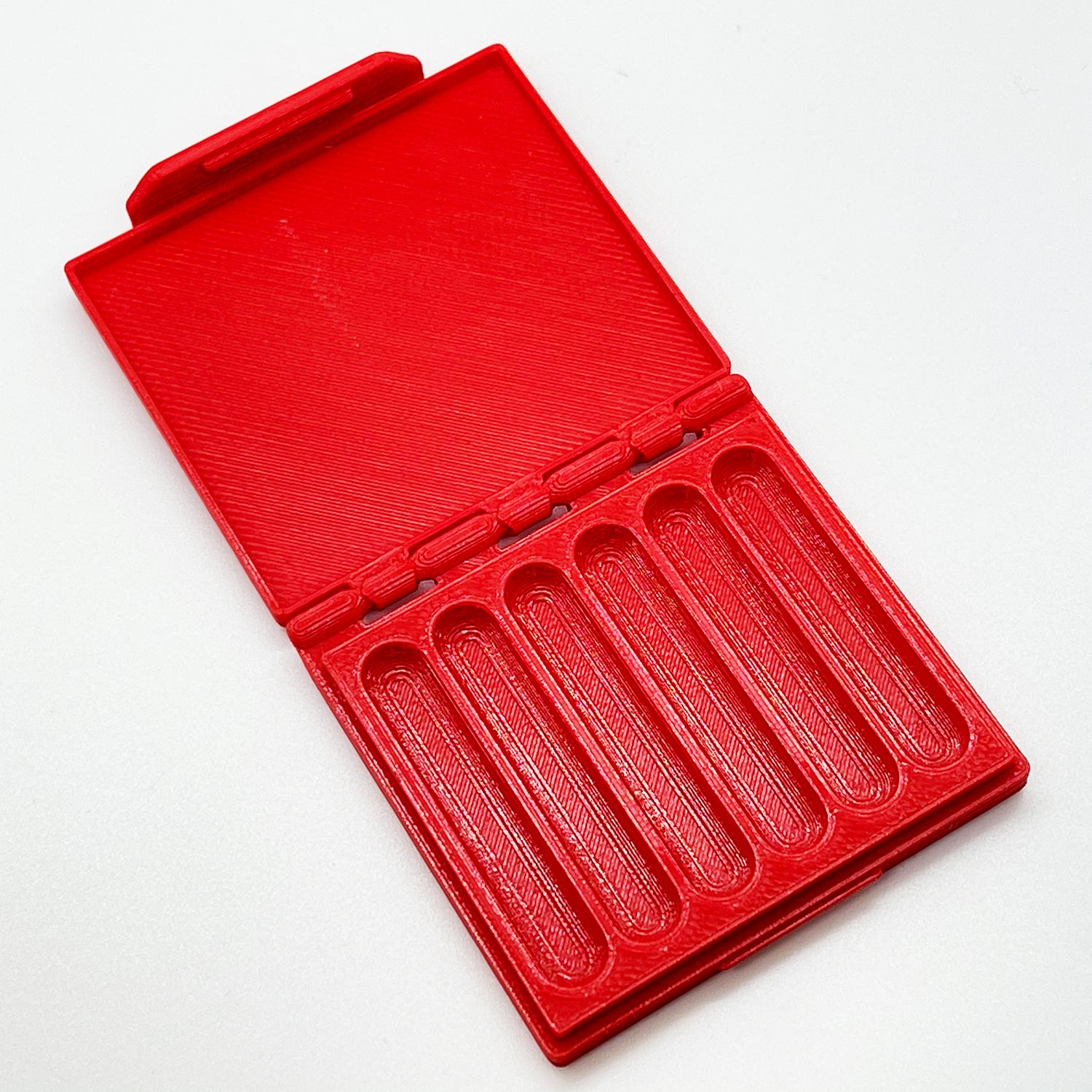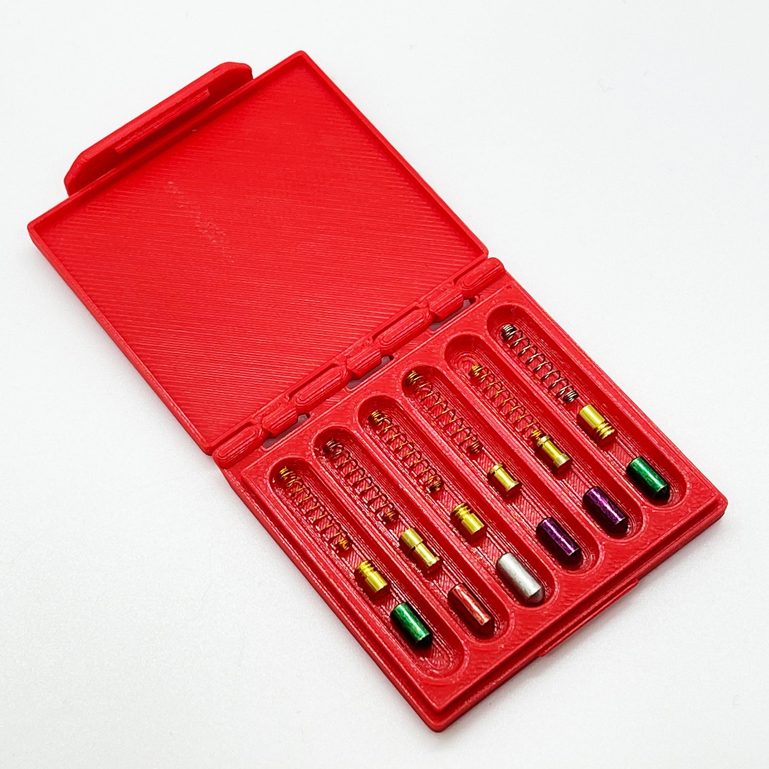 This pocket pinning track has 6 slots large enough to hold a spring, driver pin and key pin. It's so small you can carry it in your pocket and forget you even have it. It's dimensions are 48mm x 50mm x 8.5mm (1.9" x 2" x 4"). The lid had a latch on it to keep it shut. When the lid is closed it keeps all the springs and pins neatly in their own slots.