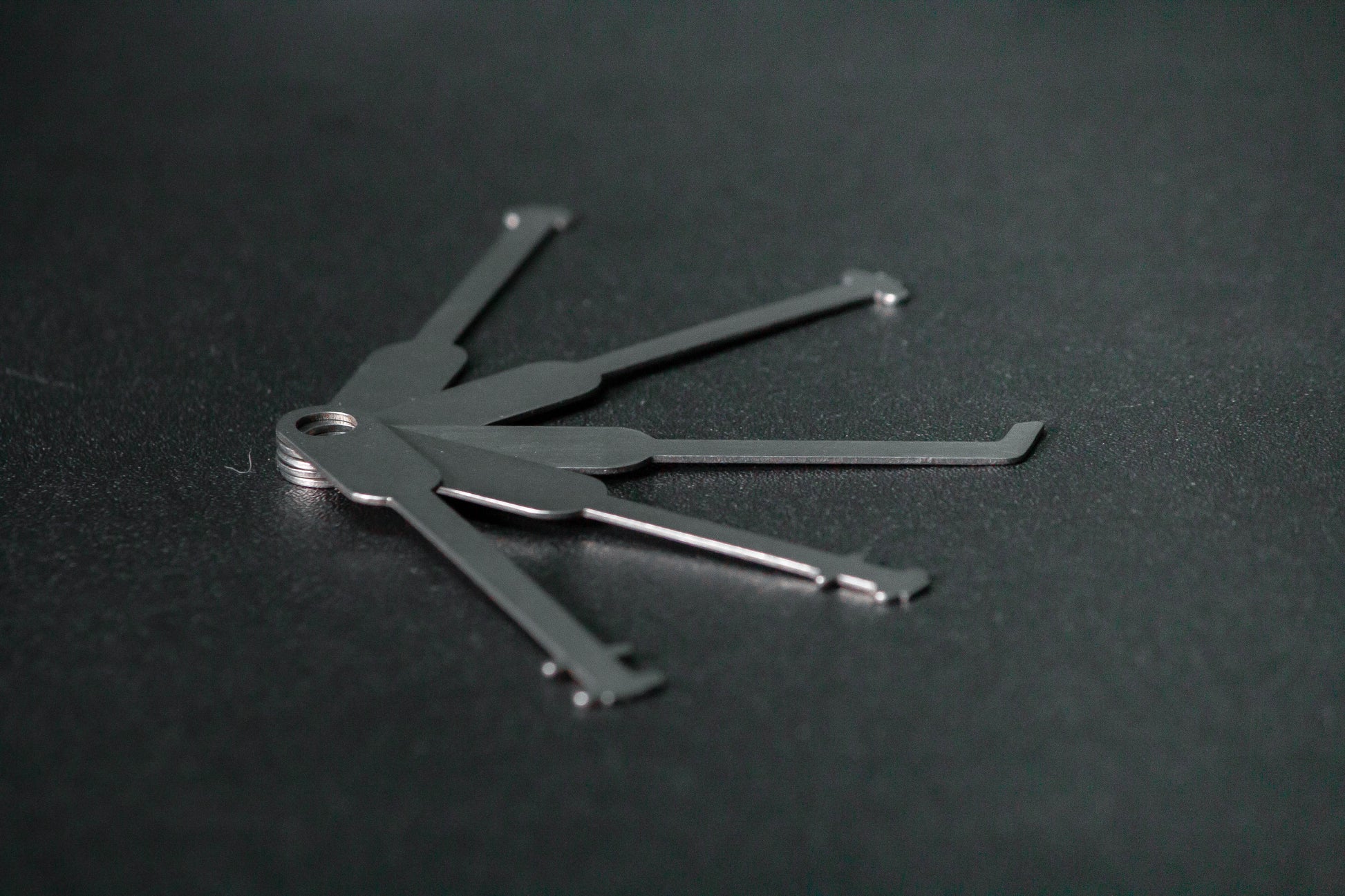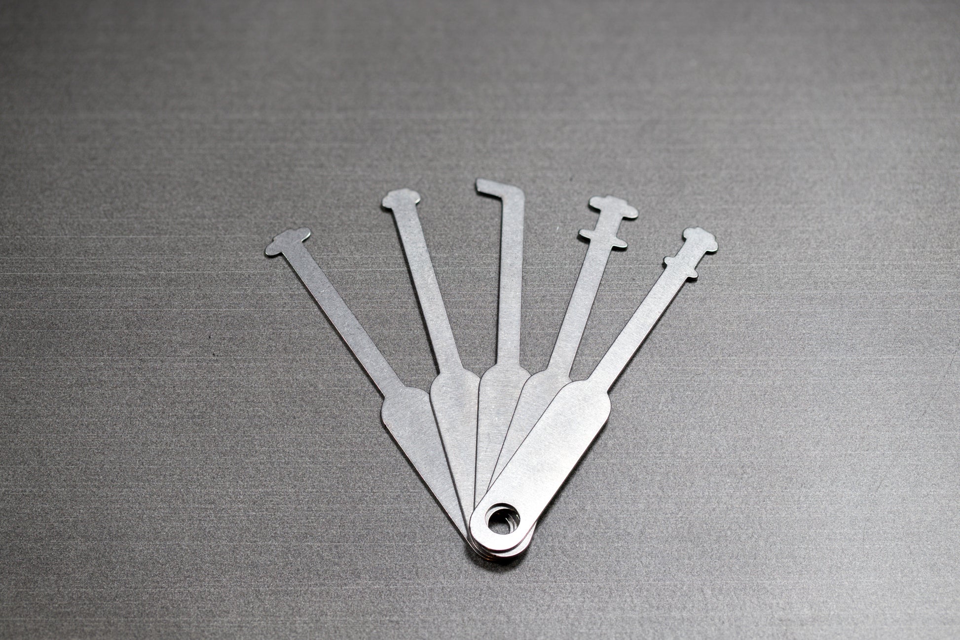 Many traditional pin tumbler locks do not weather the outside elements well. As a result, people often opt for the more hardy warded lock, despite its rudimentary design. The locking mechanism often relies on a solitary locking dog. This set of 5 picks offers a very high chance of actuating the locking mechanism.